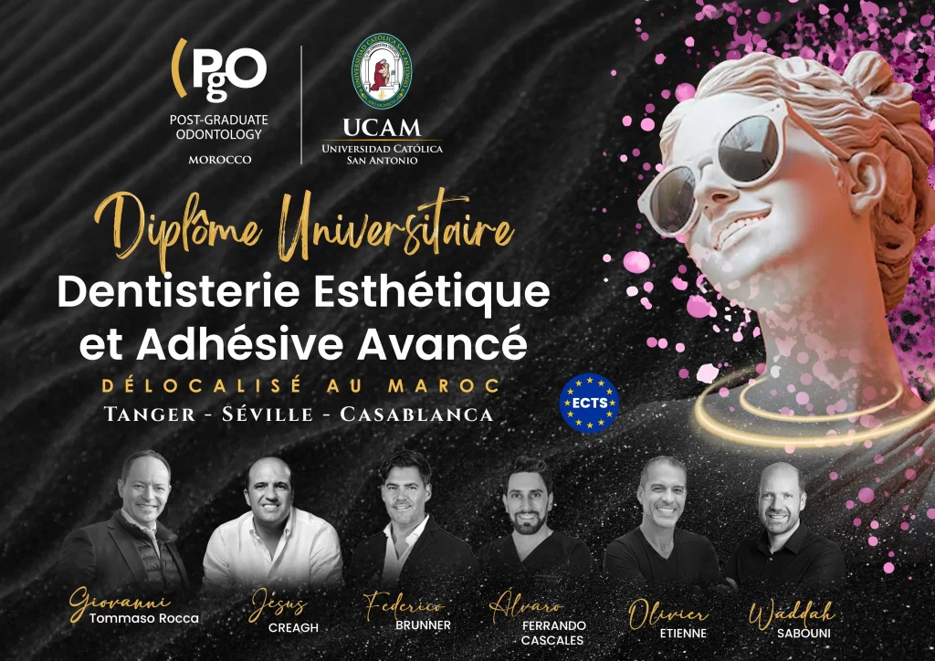 La dentisterie moderne fait face à une demande importante en réhabilitations du sourire, Nous nous devons d’y répondre avec des solutions alliant parfaitement fonction et esthétique. La dentisterie adhésive apporte des solutions très attractives de part leur aspect conservateur et efficace. Par ailleurs, les progrès technologiques liés notamment au digital, ainsi que les nouveaux matériaux développés par l’industrie imposent une constante mise à niveau de nos connaissances et des techniques afin d’adapter nos décisions thérapeutiques. Nous avons développé au fil des années des protocoles précis, basés sur la recherche clinique et in-vitro ainsi que sur notre solide expérience clinique. Le Diplôme universitaire de dentisterie adhésive et esthétique est une formation continue de 3ème cycle offerte par l’Université Catholique San Antonio de Murcia PgO-UCAM. Elle est basée sur les dernières recherches scientifiques et offre un programme théorique et pratique de haute qualité. Cette formation est destinée aux dentistes désirant se perfectionner pour répondre aux impératifs liés à l’évolution rapide et irréversible de la dentisterie moderne.